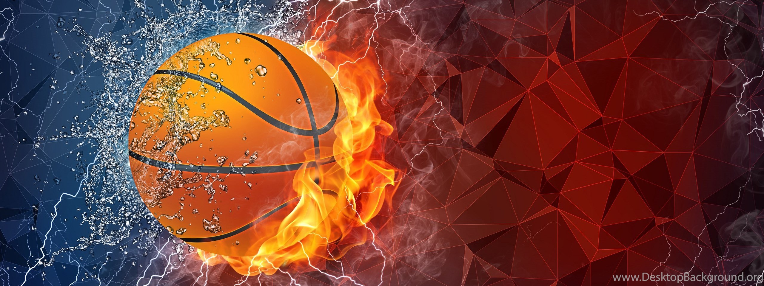 | Image Description | Basketball ball on fire and water with lightening around on abstract polygonal background. Horizontal layout with text space. |