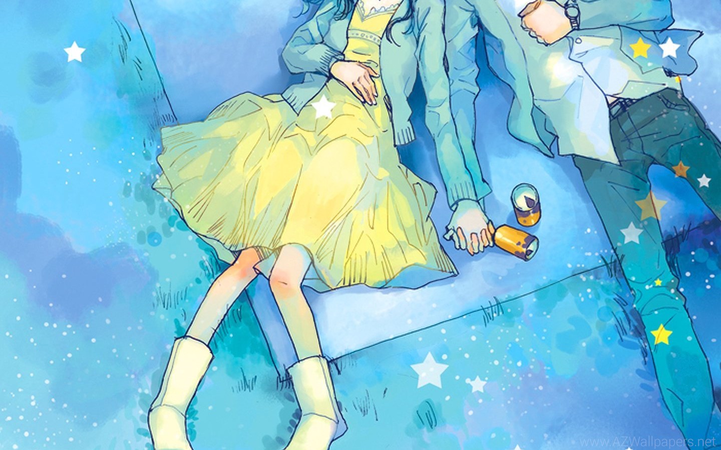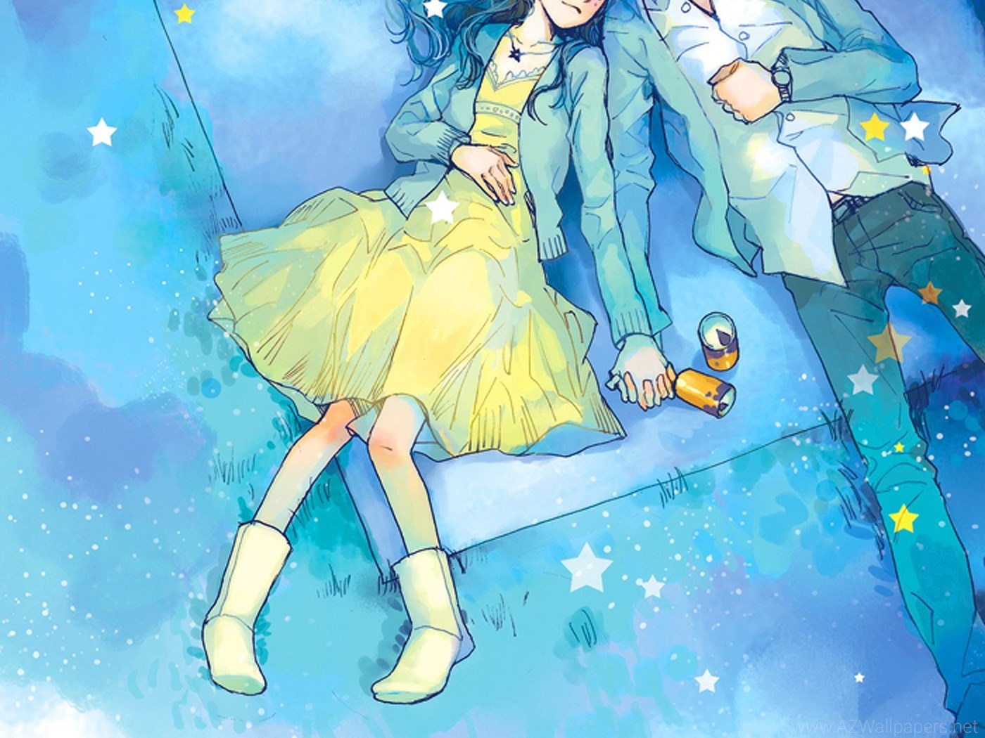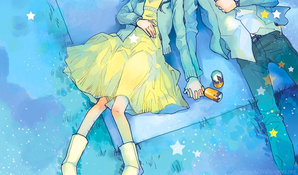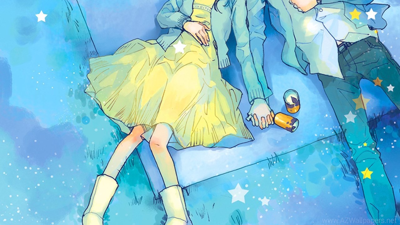 Anime Couple Yellow Dress Boy Love Stars Romantic Blue Sky Picnic ... Desktop Background