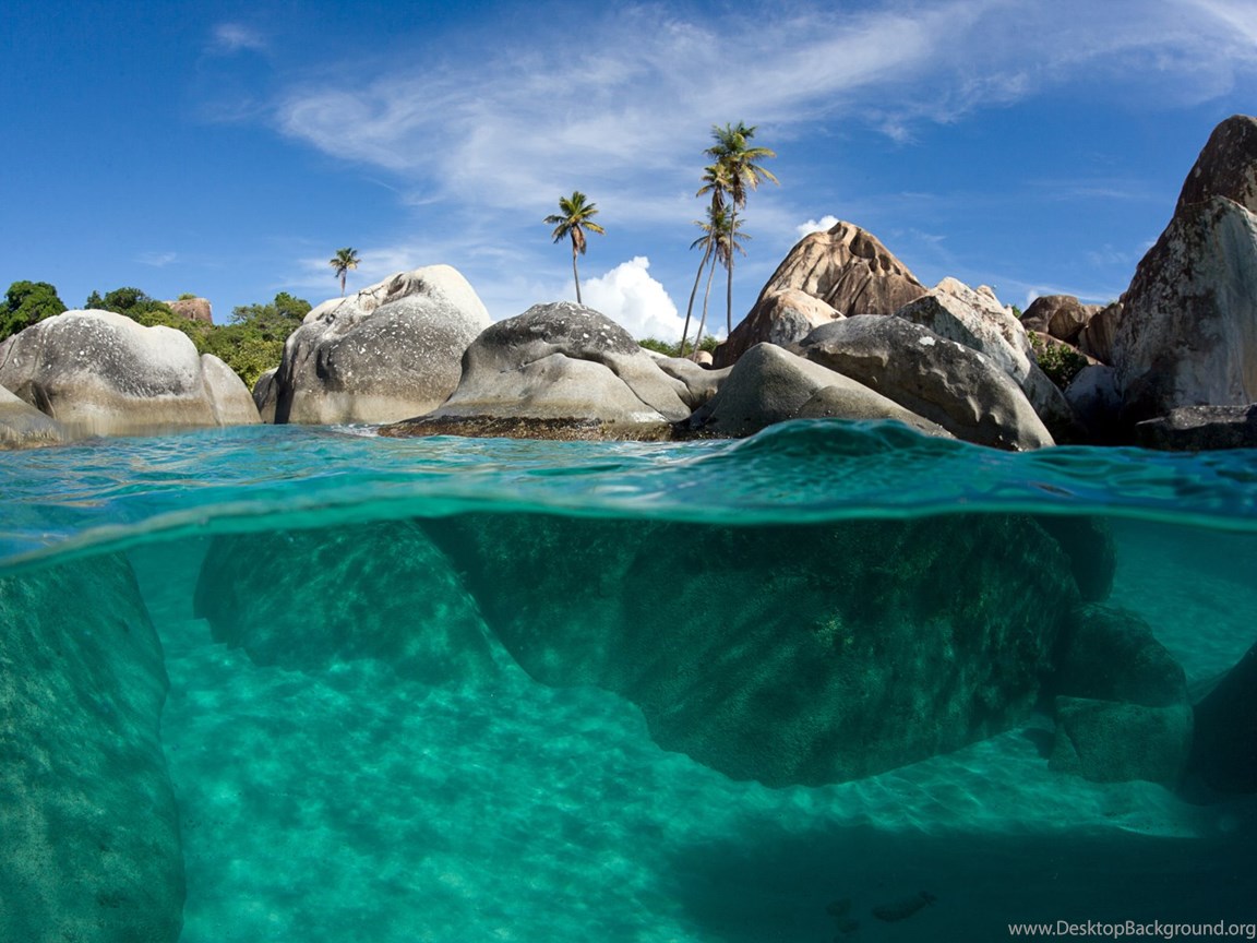 | Image Description | Underwater split view with turquoise waters, palm trees and giant rocks, The Baths, Virgin Gorda, British Virgin Islands, Caribbean |