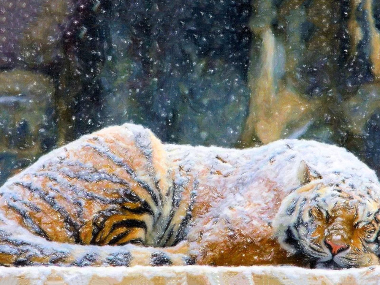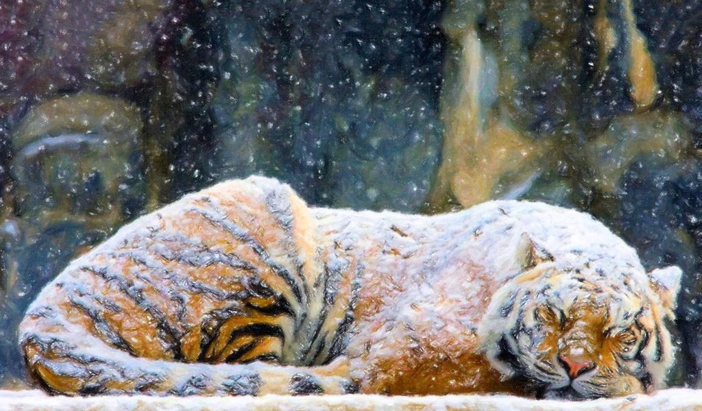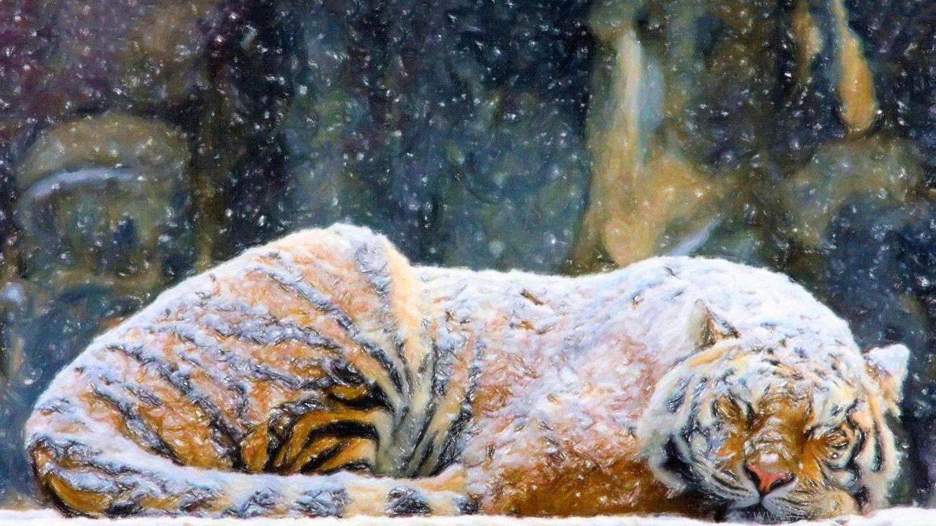 Cats: Tiger Covered Snow Painting Animals Art Paintings Winter ... Desktop Background