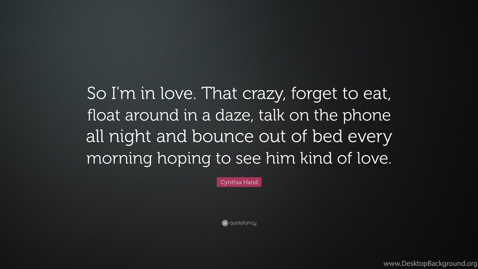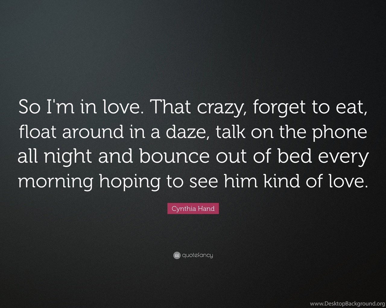Description: Download Cynthia Hand Quote: “So I'm In Love. That Crazy, Forget To Eat ... Desktop Background Desktop Background from the above display resolutions for Standart 4:3, Standart 5:4, 4K Ultra HD 16:9, Wide 21:9, Dual Screen Wide, Widescreen 16:10, Widescreen 16:9, Retina Widescreen, 4K, Sony Z5, Netbook, Tablet, Playbook, PlayStation, HD, Android HD , iPad 2017, iPad 2018, iPad Air, iPad Air 2, iPad 3, iPad 4, iPad mini 2, iPad mini 3, iPad, iPad 2, iPad mini, iPhone XR, iPhone 6 Plus, iPhone 6S Plus, iPhone 7 Plus, iPhone 8 Plus, iPhone 6, iPhone 6S, iPhone 7, iPhone 8, iPhone 5, iPhone 5S, iPhone 5C, iPod Touch 5, iPhone 4, iPhone 4S, iPod touch 4, iPhone, iPhone 3G, iPhone 3GS. If you want, you can download Original resolution which may fits perfect to your screen.