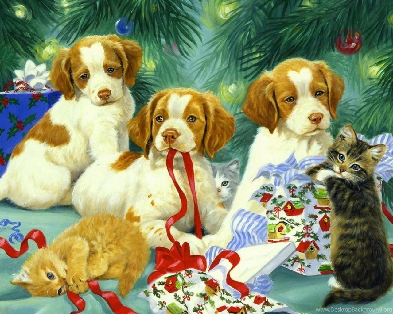 Dogs: Puppies Kittens Xmas New Year Paintings Christmas Cats Dogs ... Desktop Background