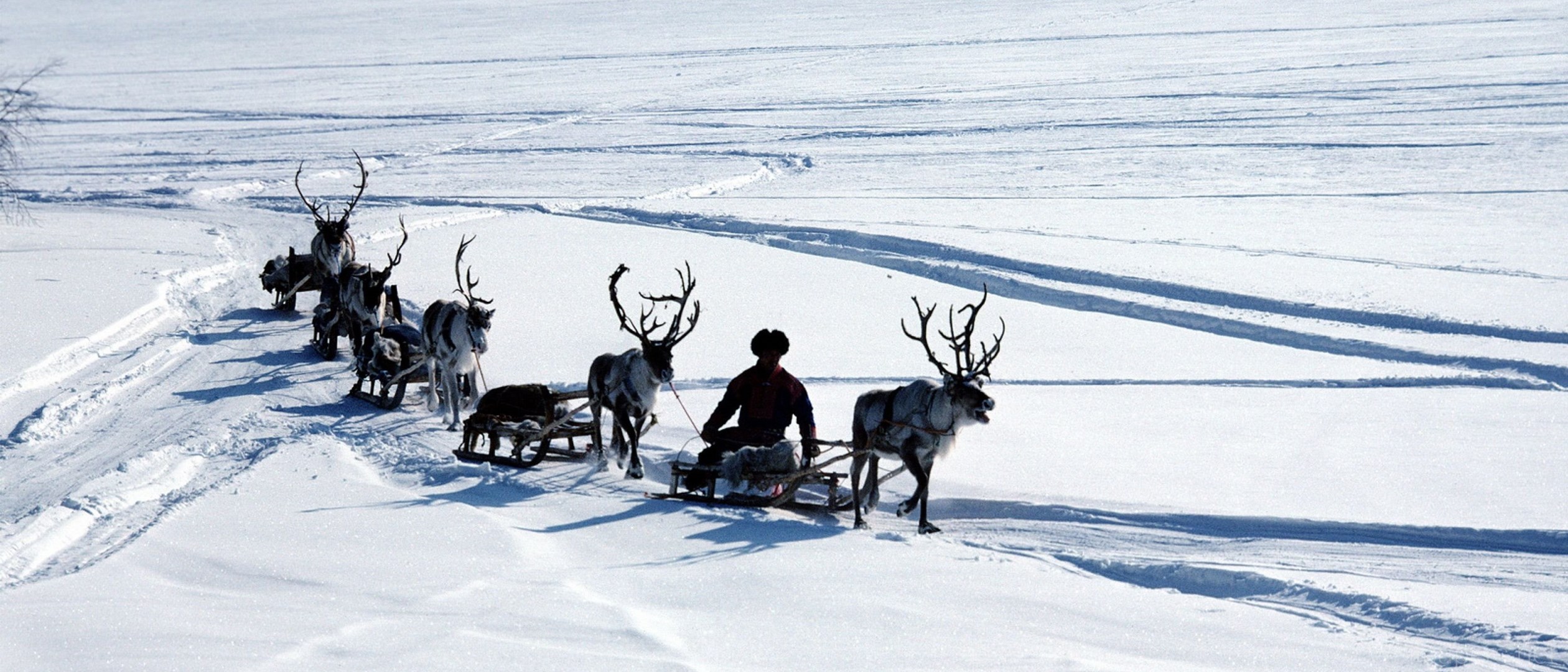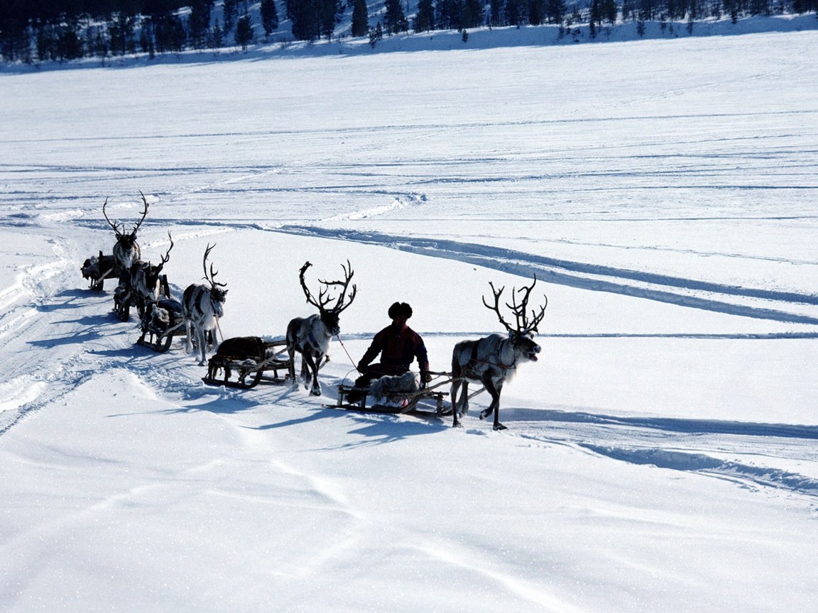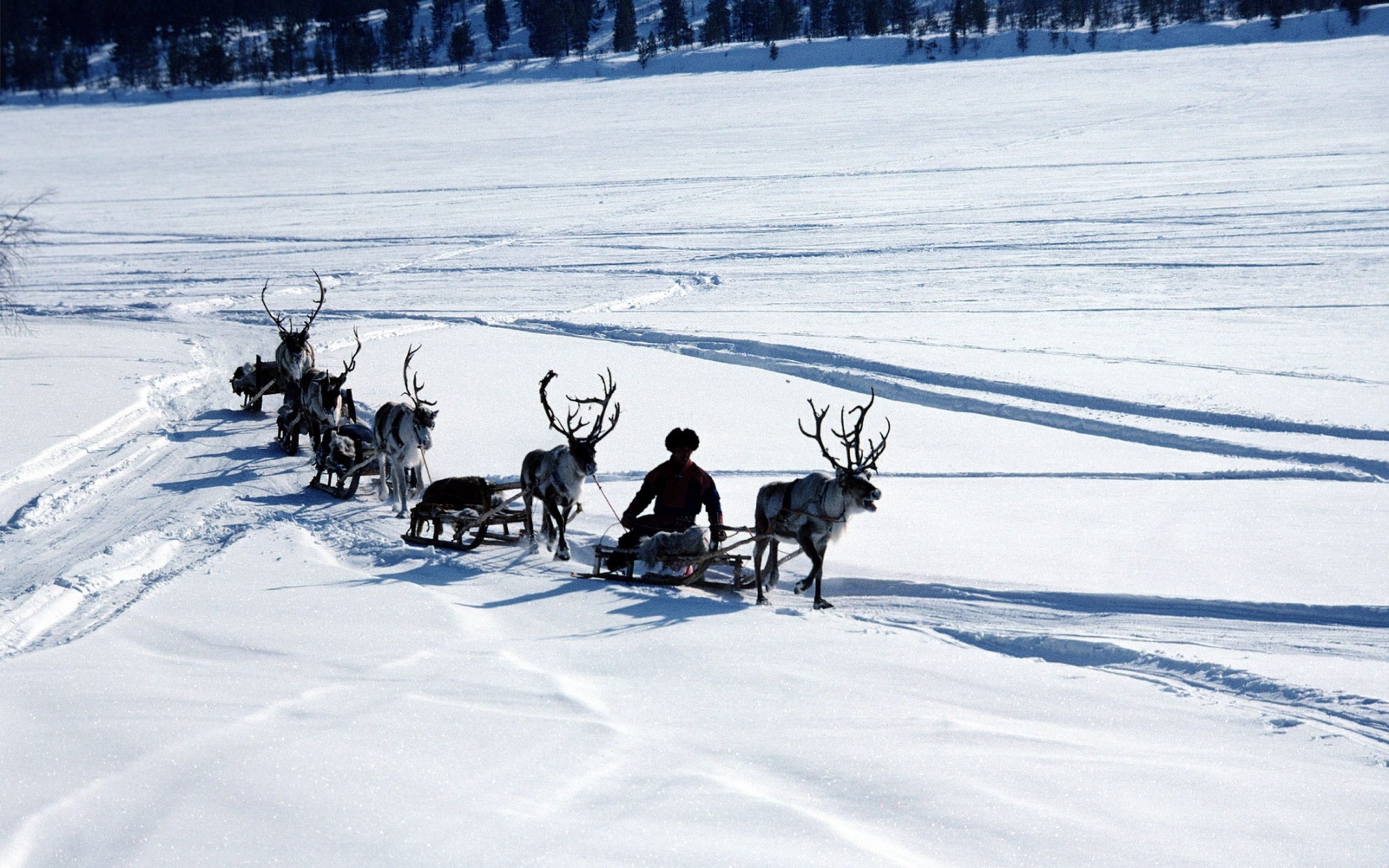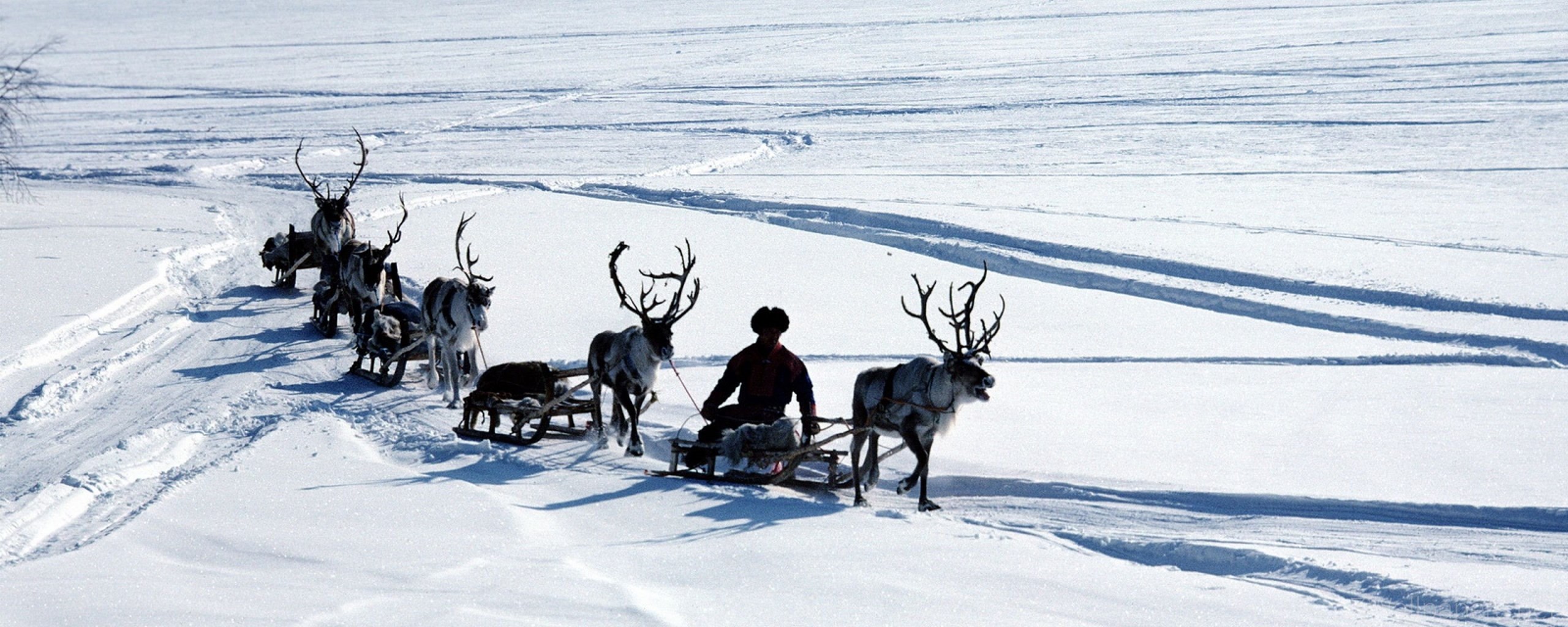 Download Wallpapers 3840x2400 Snow, Deer, Sledge, Person, Transport ... Desktop Background