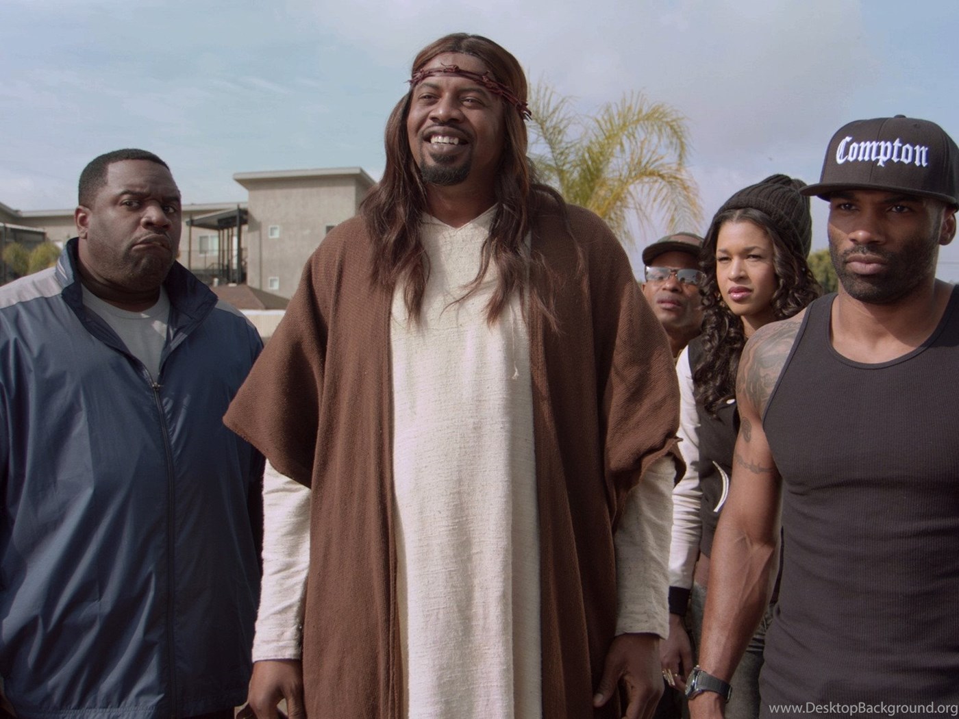 | Image Description | (L to R) Boonie (Corey Holcomb), Jesus (Gerald 'Slink' Johnson), Trayvon (Andrew Bachelor), Maggie (Kali Hawk), and Fish (Andra Fuller) defend their community garden in the new original comedy series Black Jesus, premiering Thursday, August 7 at 11 |