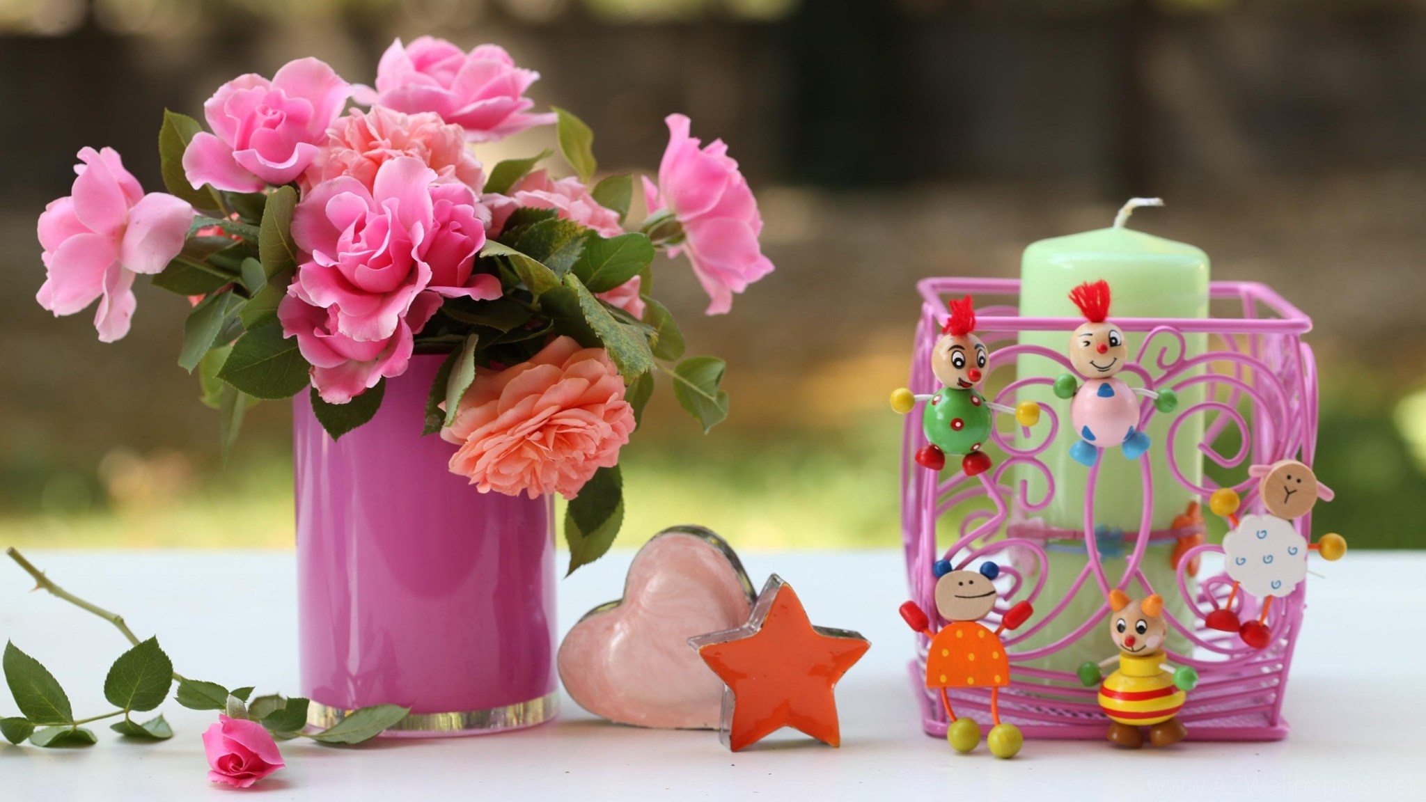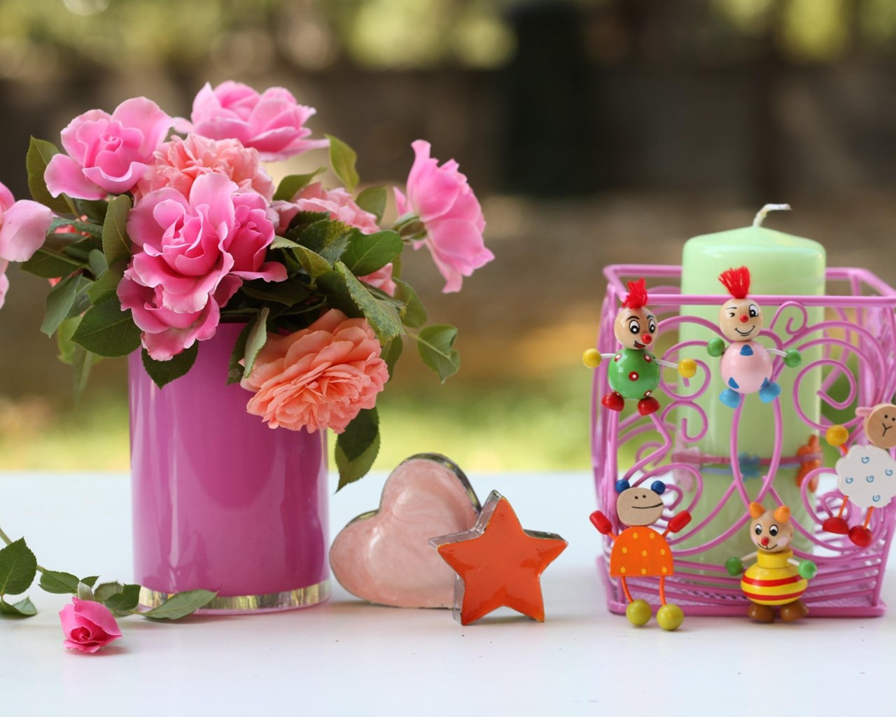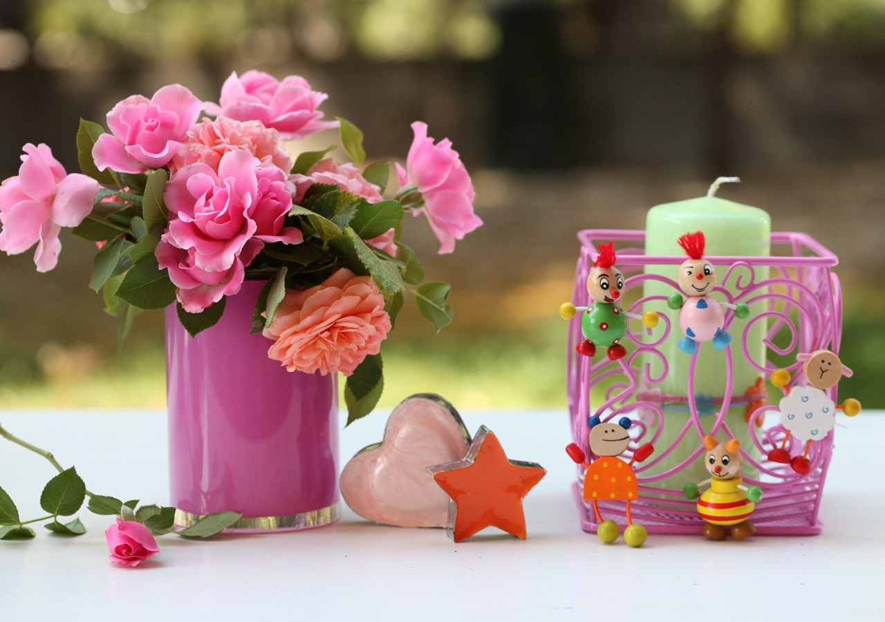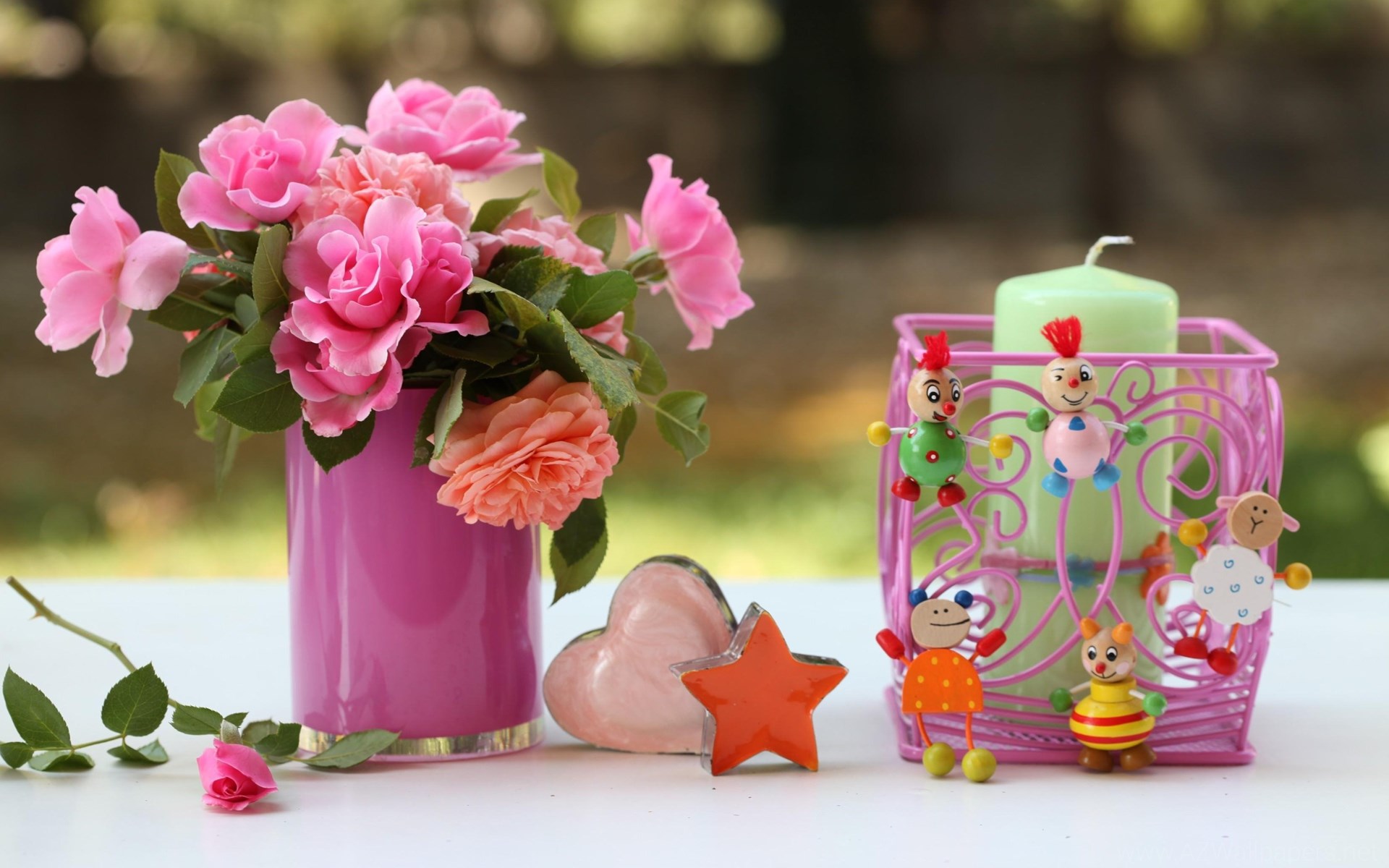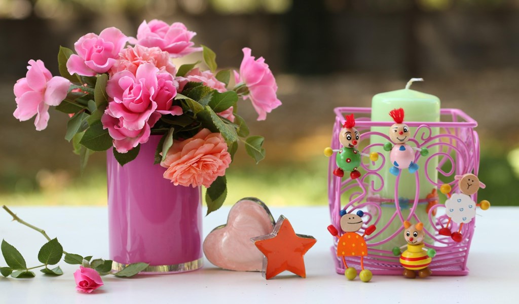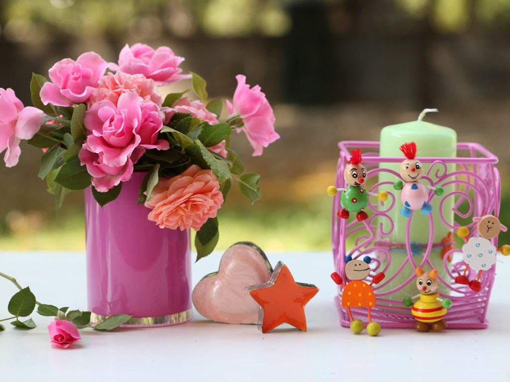 Roses Flowers Vase Heart Star Candles Toys Desktop Background