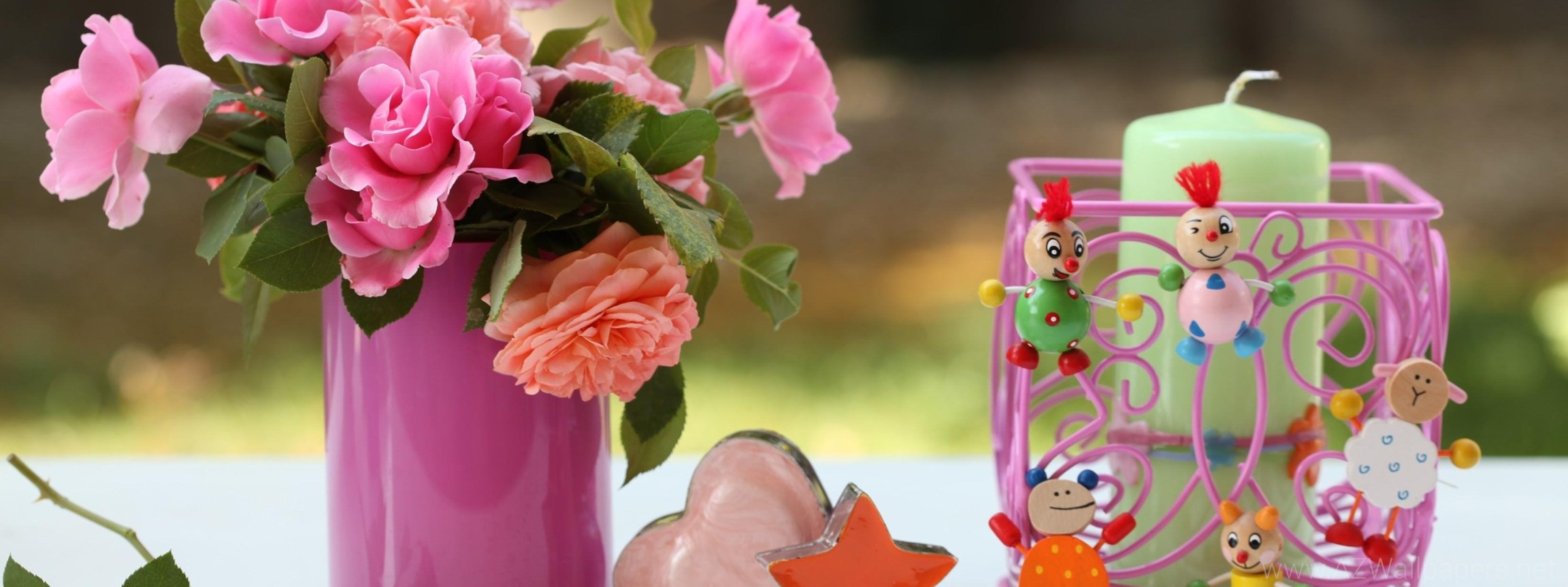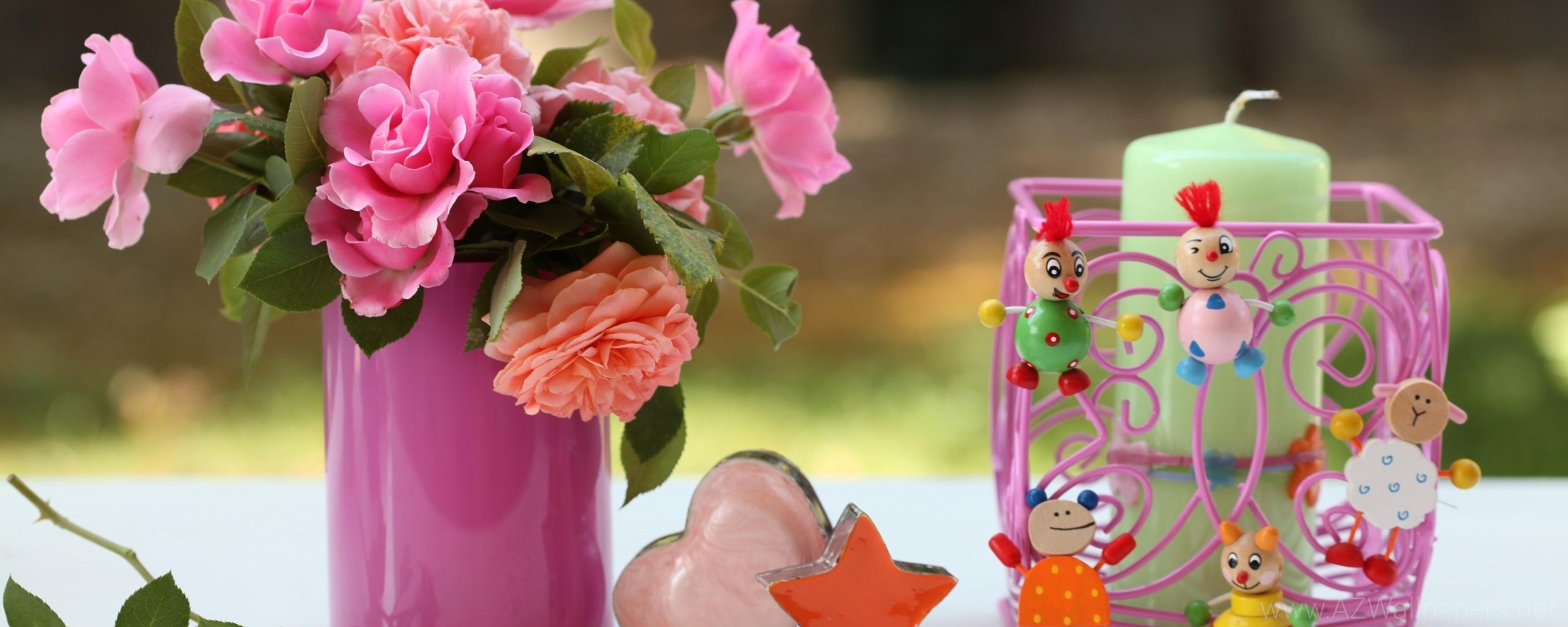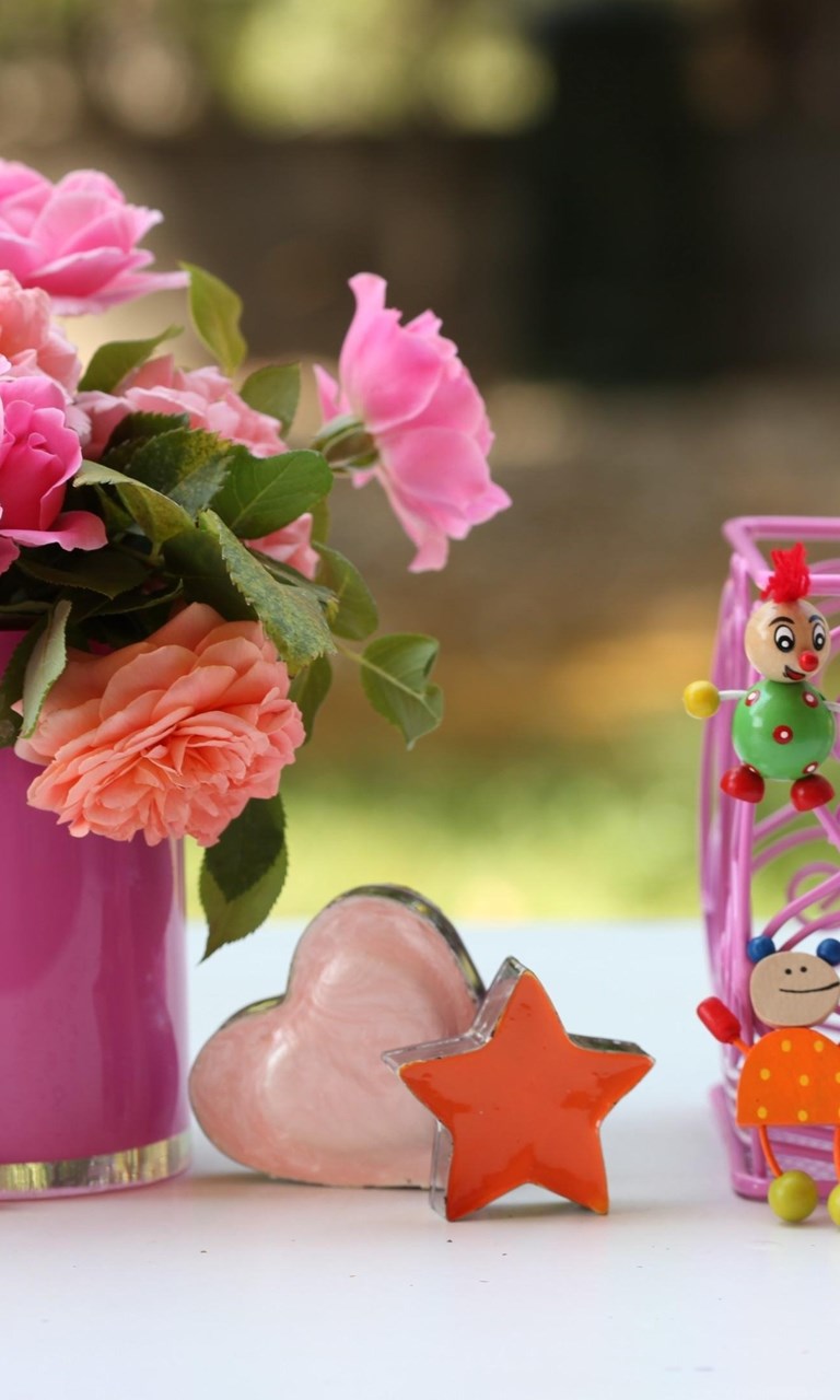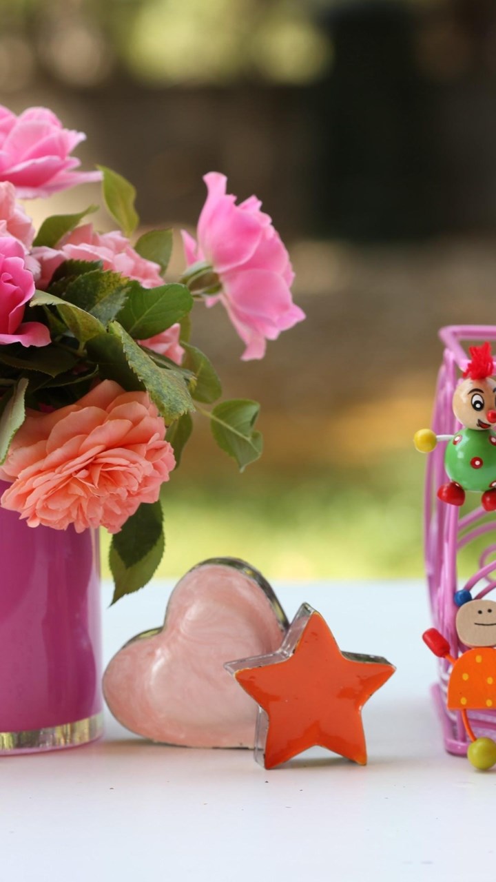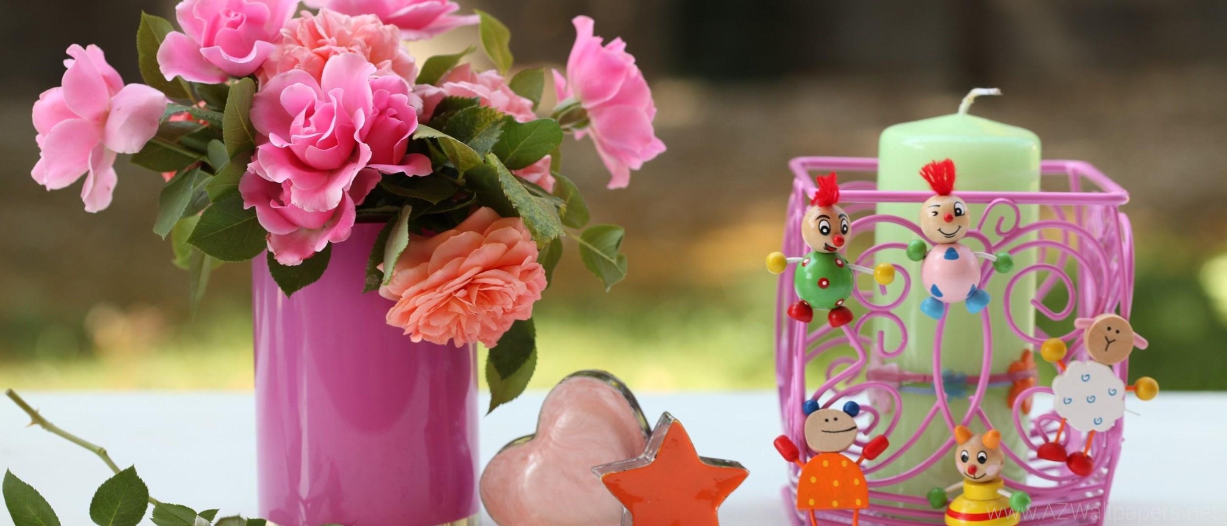 Roses Flowers Vase Heart Star Candles Toys Desktop Background