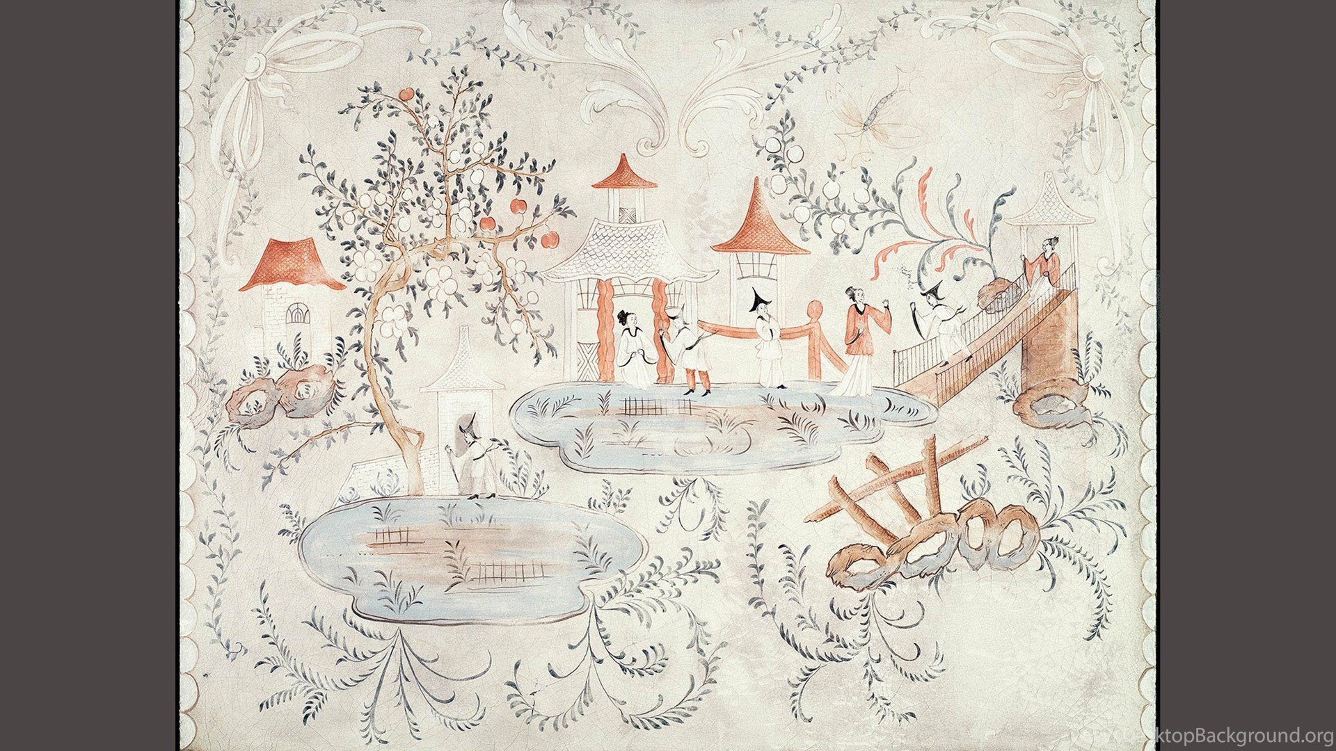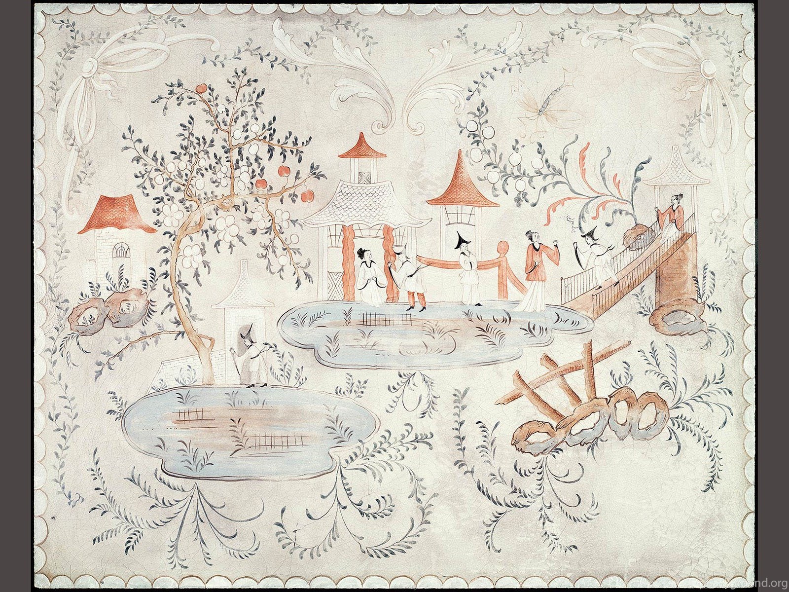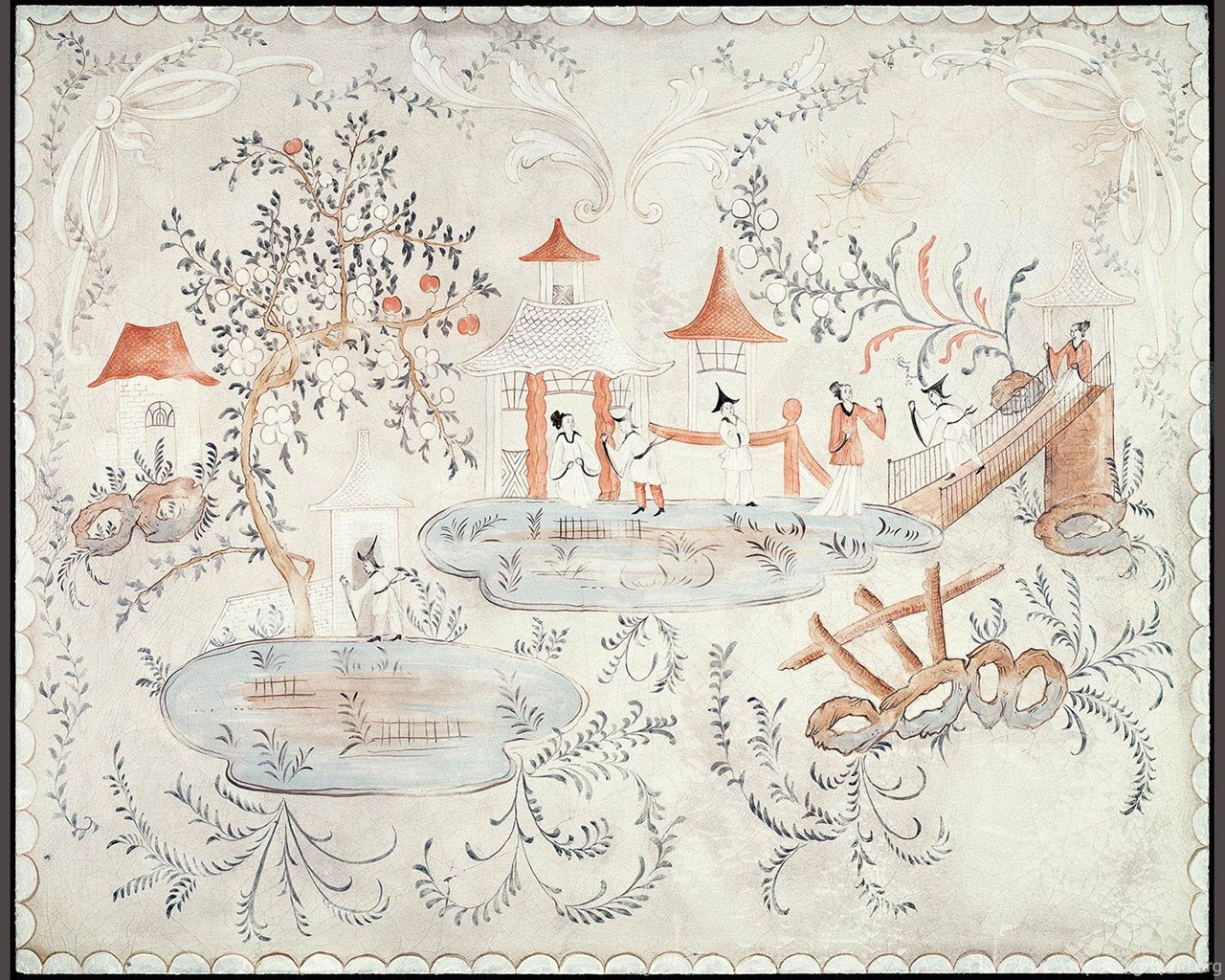 | Image Description | Detail of Swedish chinoiserie panel on cracked linen. This mural was hand painted by Lena Fransioli and Brooke Sheldon on commission of Honey Collins Design, available up to 60.5" x 49". |